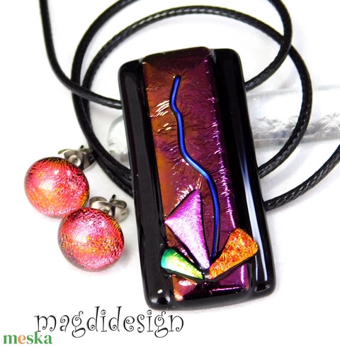 - Anyaga: színes üveg, nikkelmentes szerelék, dichroic, eozin, bőrhatású szál, nemesacél