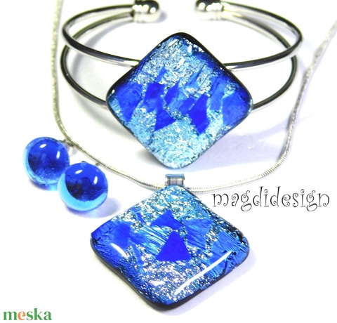 Ezüst rombusz kék lapokkal üvegékszer szett nyaklánc, karkötő, stiftes fülbevaló