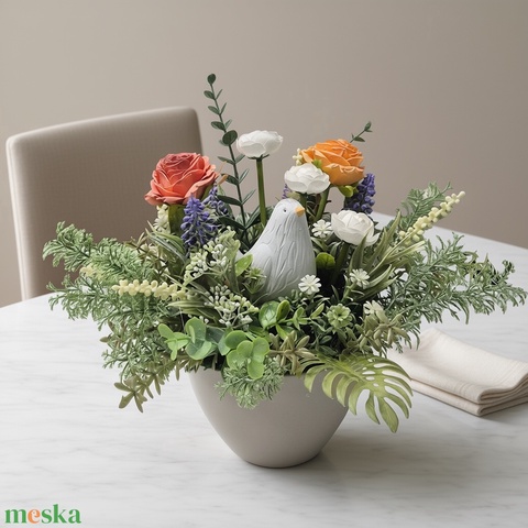Virágos asztaldísz madárfigurával