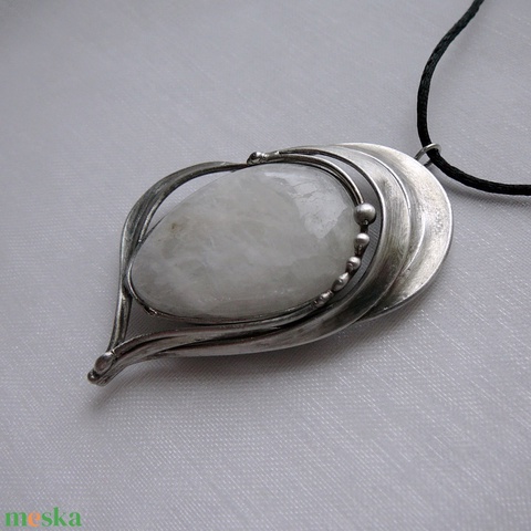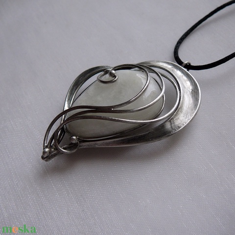 A medál Tiffany technikával készült holdkő és ólommentes, ezüsttartalmú ón felhasználásával. A díszítés szintén saját készítésű, nem tartalmaz gyári elemeket. A fémrészt óezüstre patináztam és lelakkoztam, hogy sokáig szép maradjon.
