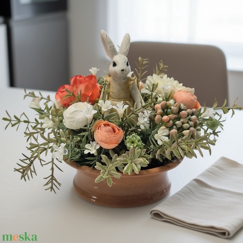 Virágos asztaldísz nyuszifigurával – elegáns, gondozásmentes dekoráció