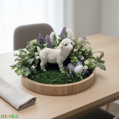 Bárányos asztaldísz fa tálcán – természetes hatású dekoráció