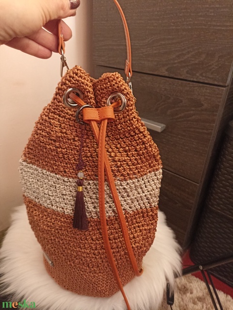 A táska erős, tartós fonalból készült, a felső részén pedig minőségi bőrhatású zsinór és fém bújtatók adják a stabil, elegáns záródást.