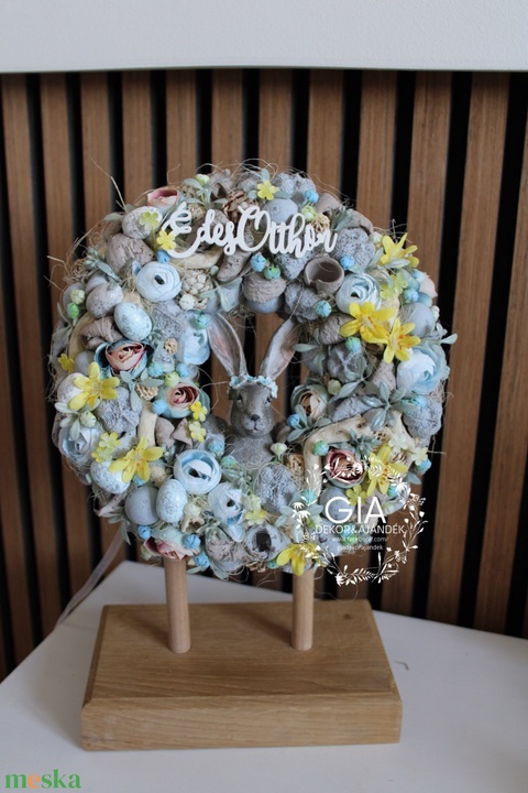 - Anyag/Összetevő szalmakoszorú, nyuszifigura, termések, selyemvirág, szizál
