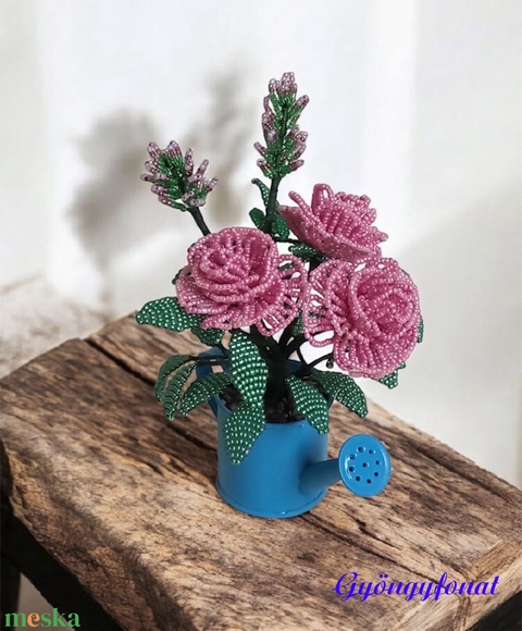 Rózsaszín rózsa levendulával gyöngyből, asztaldísz
