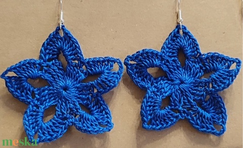 Horgolt fülbevalók, csinos, mutatós darabok, kék színben. Csillag formájú mérete akasztó nélkül: 5 cm. Virág formájú mérete akasztó nélkül: 4,5 cm. Enyhén keményítve a szép tartás érdekében.