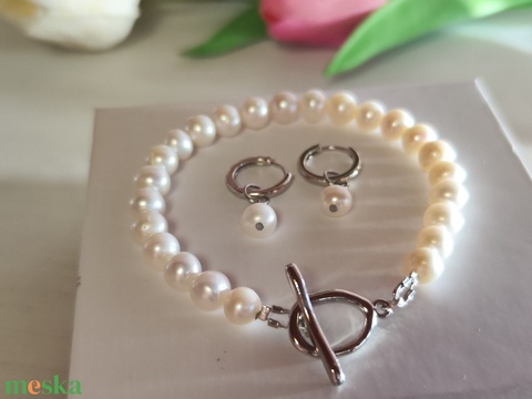 Elegáns gyöngyszett: S925 ezüst fülbevaló + karkötő – lágy fényű álom! - mágneses díszcsomagolásban!