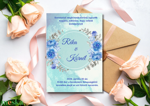 Kék virág keretes esküvői meghívó