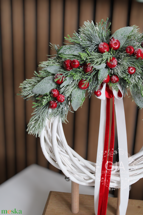 vesszőkoszorú, műzöldek, pirosbogyós, bársonyszalag