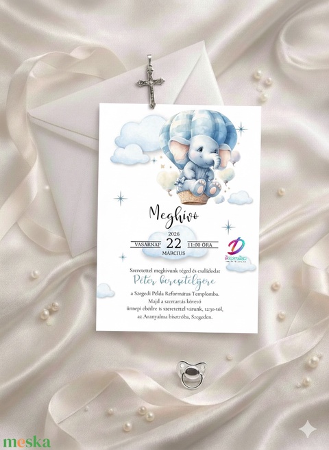 Finom grafikai elemek, harmonikus tipográfia és visszafogott színek segítik, hogy a meghívó méltó legyen a keresztelő ünnepélyes hangulatához.