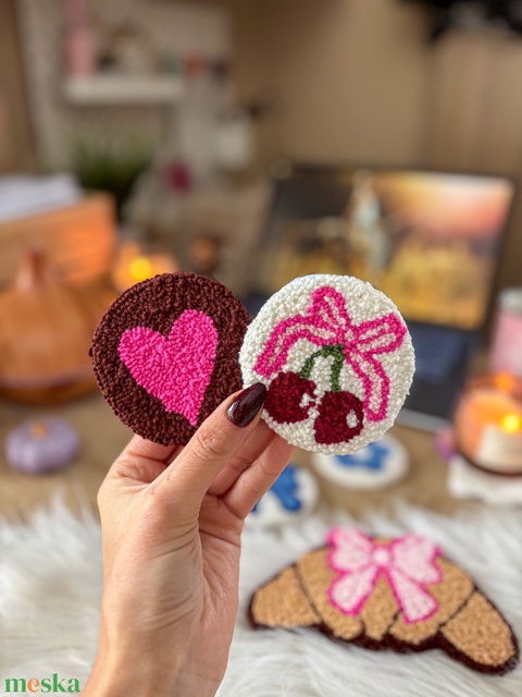 Hímzett autós poháralátét, szív, meggy