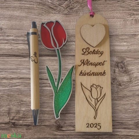 Egyedi, névreszóló könyvjelző és bambusz toll – virágos ajándék