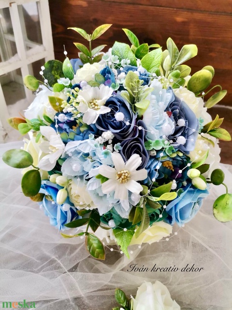 Gyöngyös Valami kék Menyasszonyi csokor, örökcsokor, selyemvirág csokor kitűzővel,