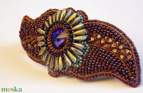 - Anyaga: swarovski rivoli, delica, miyuki kása gyöngy, bőr, francia drót, szirom gyöngy, bronz karika