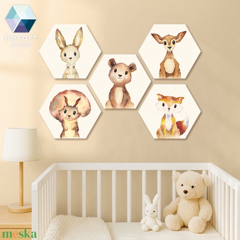 Dekoráld ki a babaszobát ezzel az 5 darabos, hatszög formájú fali dekoráció szettel! A dekorációk alapját mesevilágot idéző akvarell festményeim adják. Kedves kis állatportrék: mókus, őzgida, maci, nyuszi és róka egységes stílusban elkészítve. Az erdei állatok barátságos kisugárzása meghitt hangulatot teremt a babaszobában és bármilyen berendezéshez illik. Ideális választás, ha természetközeli és szeretetteljes légkört szeretnél teremteni kisbabád szobájába.