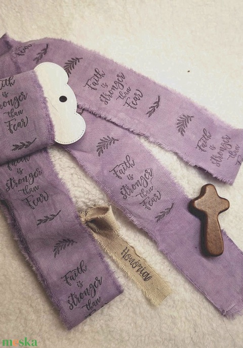 Kézzel festett és bélyegzett, tépett, pamutszalag, Bibliai, igés, felirattal- antik lila-003