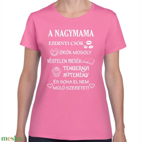 A nagymama ezernyi csók örök mosoly végtelen mesék feliratos póló nagymamának. Minőségi 100% pamut egyedi póló.