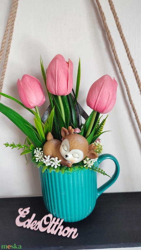 Őzikés bögrés tavaszi dekoráció – „Édes Otthon”