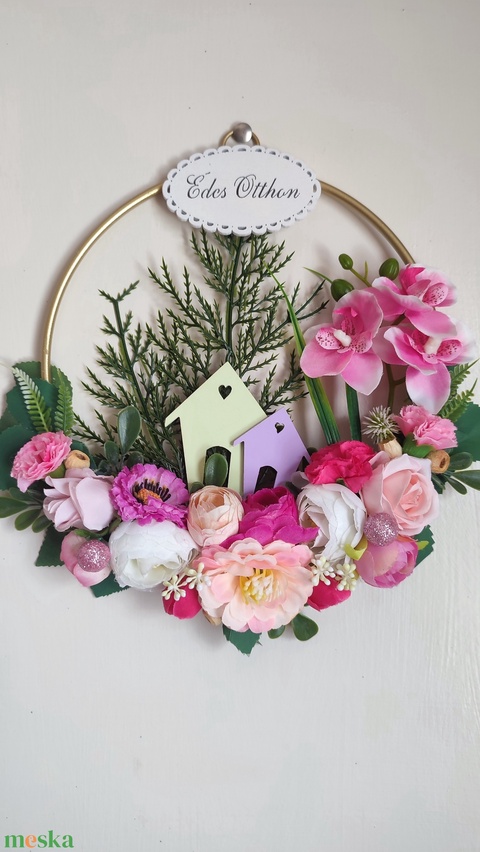 „Édes Otthon” ajtódísz – virágos házikókkal