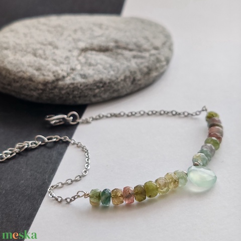 nemesacél lánc, kalcedon csepp, turmalin rondella, sterling ezüst drót