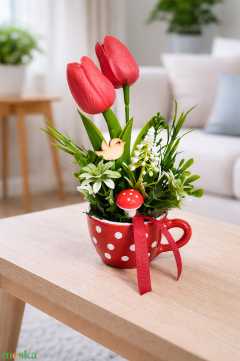 Tavaszi asutaldísz piros pöttyös csészében