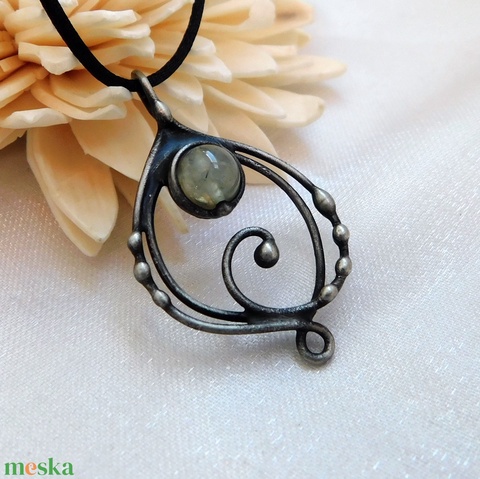 A medál Tiffany technikával készült prehnit, folyami gyöngy, réz és ólommentes, ezüsttartalmú ón felhasználásával. A díszítés szintén saját készítésű, nem tartalmaz gyári elemeket. A fémrészt óezüstre patináztam és lelakkoztam, hogy sokáig szép maradjon.