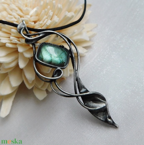 A medál Tiffany technikával készült labradorit, réz és ólommentes, ezüsttartalmú ón felhasználásával. A díszítés szintén saját készítésű, nem tartalmaz gyári elemeket. A fémrészt óezüstre patináztam és lelakkoztam, hogy sokáig szép maradjon.