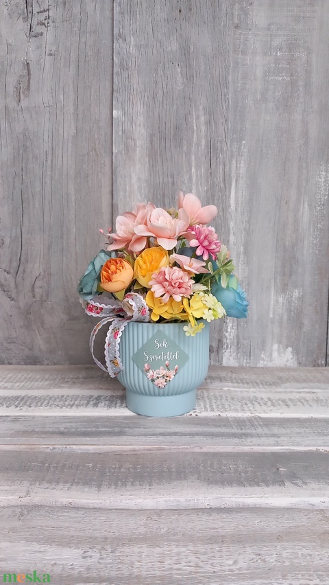 - Anyaga: szalag, művirágok, tűzőhab, műzöldek, műanyagkaspó