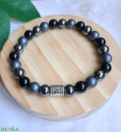 Férfi ónix–hematit karkötő matt hematittal - Minimalista ásvány karkötő