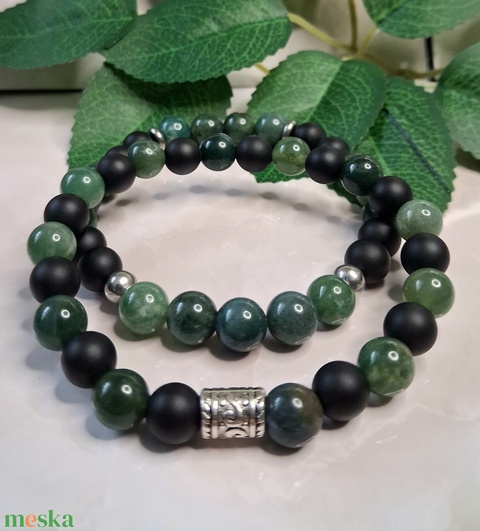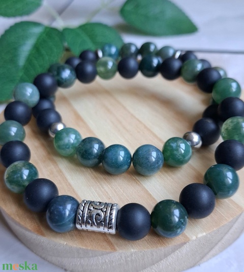 Férfi karkötő szett – moha achát és matt ónix - 2 db-os ásvány karkötő