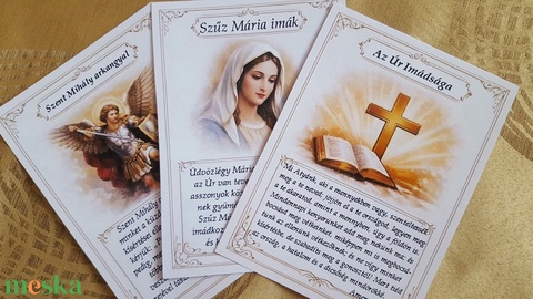 A szentképek és imák bármilyen alkalomra csodás ajándékok. Saját tervezésemben egy oldalon szerepel a kép és az ima, így nem kell forgatni, bárhová kitehető ezáltal. 14cm hosszú, így elhagyni sem lehet. Különösen szép ajándék annak, aki még nem tudja az imádságokat fejből, így könnyedén megtanulhatja. Ajánlom még keresztelőre, elsőáldozásra, bérmálkozásra, illetve bármilyen egyházi alkalomra. Az 5db imádság szabadon választható, ezt megjegyzésbe kérem beírni. A feltüntetett ár 5 imalapot tartalmaz! Ha többet is szeretnél vásárolni, annak megfelelően kell kosárba helyezni őket (10db esetén kettőt és így tovább) Imalapok: