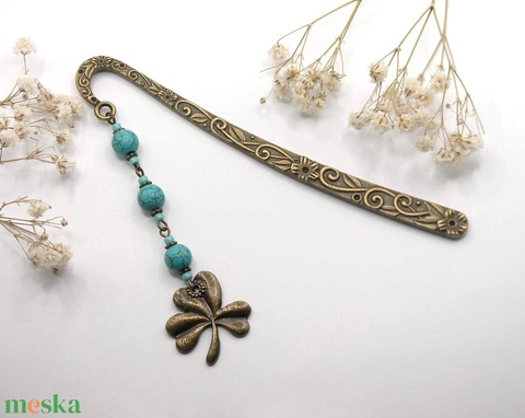 AJÁNDÉK csomagolás! Antik bronz, viragos-indás könyvjelző türkinit ásványgyöngyökkel, lóhere alakú függővel – Boglárka