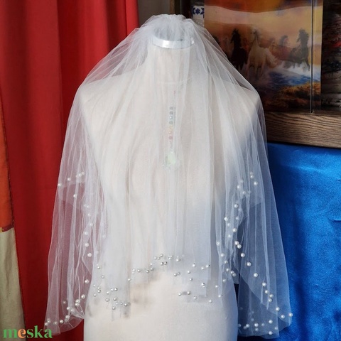 FTY145 - 2 rétegű, szegetlen, törtfehér gyöngyös menyasszonyi fátyol 56/75x150cm