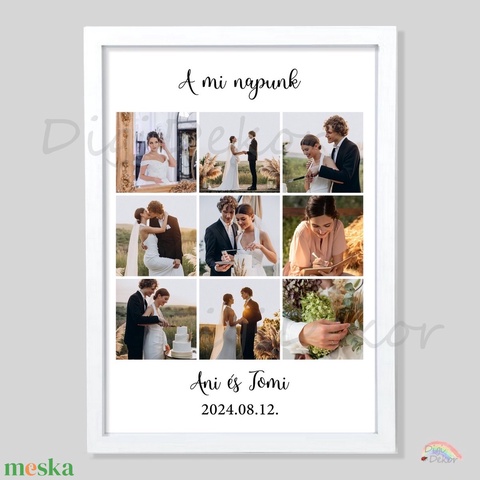 Egyedileg szerkesztett fotómontázs szerelmeseknek. Az általad küldött fényképeket (9 db-ot) illesztjük be a kollázs négyzetibe. Tökéletes, személyes ajándék Valentin-napra, évfordulóra, esküvőre, karácsonyra, születésnapra.