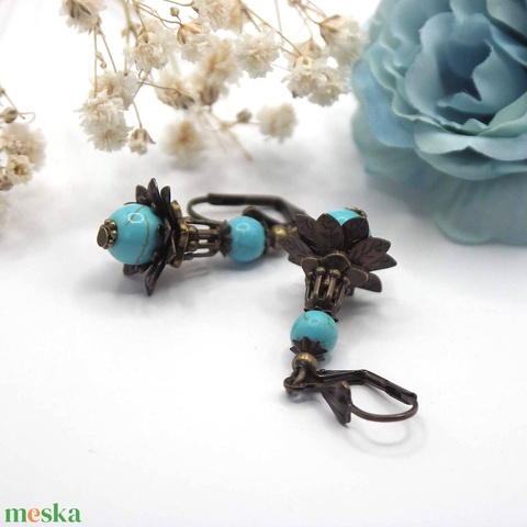 Fülbevaló türkiz színű, howlit ásványgyöngyből, különleges gyöngykupakokkal kiegészítve