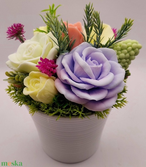 - Anyaga: szappanalap, szappanszínezék, illatolaj, virágtűzőhab, fapálca, fémdrót, műnövény, ragasztó