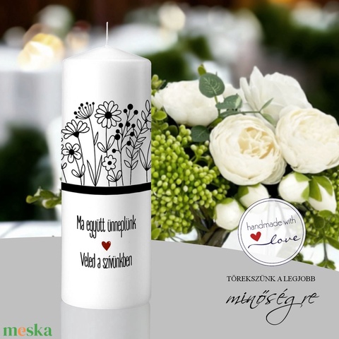 A Veled a szívünkben esküvői emlékgyertya azoknak a pároknak készült, akik az esküvő napján szeretnének méltó módon megemlékezni elhunyt szeretteikről. Bár ők már nem lehetnek jelen testben, emlékük és szeretetük örökre velünk marad. A letisztult, fehér esküvői gyertyát finom, kézzel rajzolt virágmotívum díszíti, amely a tiszta emlékezést, az összetartozást és az örök szeretetet szimbolizálja.