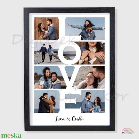 Egyedileg szerkesztett fotómontázs szerelmeseknek. Az általad küldött fényképeket (8 db-ot) a LOVE szó betűi mellé szerkesztjük. Tökéletes, személyes ajándék Valentin-napra, évfordulóra, esküvőre, karácsonyra, születésnapra.