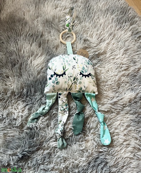 Kézműves Textil Polip – babakocsira akasztható készségfejlesztő játék :) A babák számára az első hónapokban a legfontosabb a környezetük felfedezése érintéssel és hallással. Ezt a játékot úgy terveztük, hogy minden porcikája ingerelje a baba érzékszerveit: Auditív élmény: A polip fejében egy lágy hangú csörgő található, amely minden érintésnél hangot ad, így segítve az ok-okozati összefüggések felismerését. Taktilis (érzékszervi) fejlődés: A polip „csápjai” különböző textilekből készültek. A baba találkozhat a puha muszlin, a texturált waffle anyaggal, puha minkyvel és a sima pamutvászonnal is, ami fejleszti a tapintást és a finommotorikát. Vizuális inger: A pasztell, mégis kontrasztos színek és a bájos minták lekötik a figyelmet. A játékot egy természetes fa karikával és egy patentos textilszalaggal láttuk el, amivel pillanatok alatt rögzíthető a babakocsira. Könnyen felakasztható hordozóra vagy a kiságy szélére. Kiváló ajándék babaváró buliba vagy az első látogatás alkalmával!
