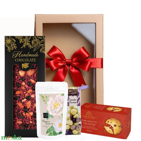 kézműves csokoládé, gyümölcstea, levendulás földimogyoró drazsé, vajas keksz, díszcsomagolás