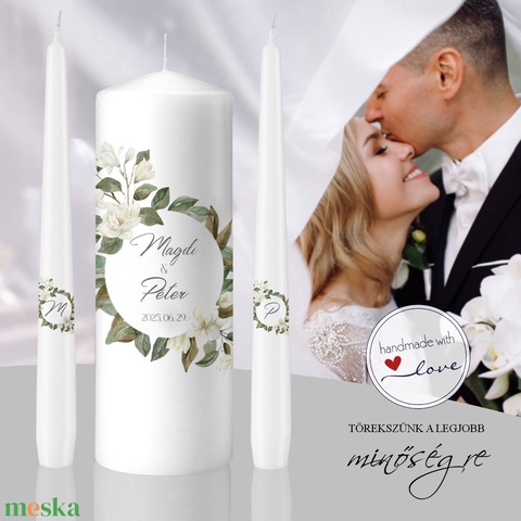 A Magnólia esküvői gyertya szett az elegancia és a természet harmóniájának megtestesítője, amely tökéletes választás minden romantikus szertartáshoz. A gyertyákon megjelenő magnóliaminták finom részletei a tisztaságot és a szeretet időtállóságát szimbolizálják, miközben lágy zöld árnyalataik természetes és friss hangulatot kölcsönöznek a dekorációnak. A személyre szabott név- és dátumfeliratok különlegessé teszik a szettet, amely méltó emlék lesz az esküvő legszebb pillanatairól. Kézzel készített, prémium minőségű gyertyái gondosan megmunkáltak, hogy tökéletesen illeszkedjenek az esküvő elegáns stílusához. A Magnólia esküvői gyertya szett azok számára készült, akik szeretnék, hogy a szeretetük története természetes szépséggel ötvözve váljon emlékezetessé.