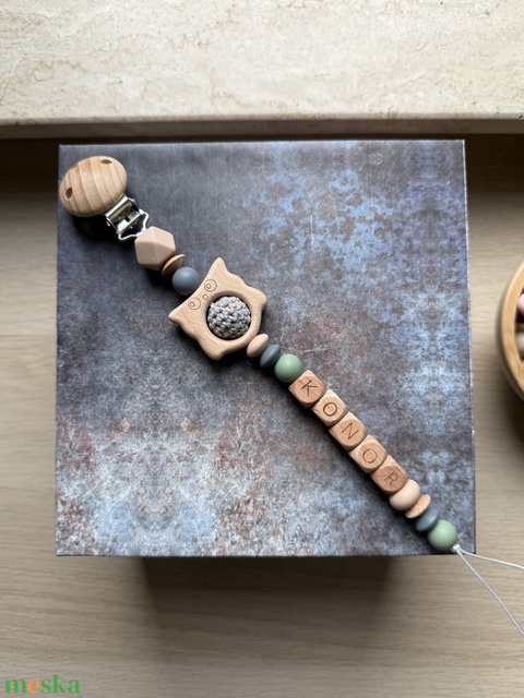 Ez a kézzel készült cumilánc abban segít, hogy a cumi mindig kéznél legyen, és ne essen le a földre a mindennapokban. Praktikus kiegészítő sétához, utazáshoz vagy akár otthon, amikor a baba épp felfedez és mozog.