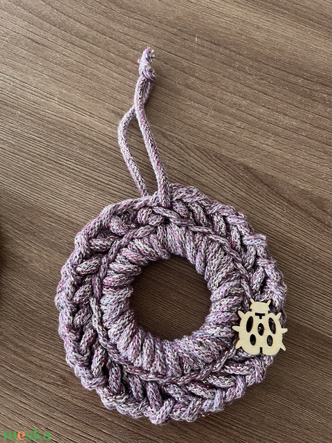 7 cm fa karikára horgolt aranyos kis akasztható díszek, melyeket akár kilincsre, kocsiba tehetünk vagy csak egyszerűen lakásdekorációs elemként is funkcionálhat.