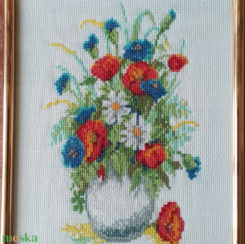 Keretezett falikép gobelin hímzéssel, virágcsokor