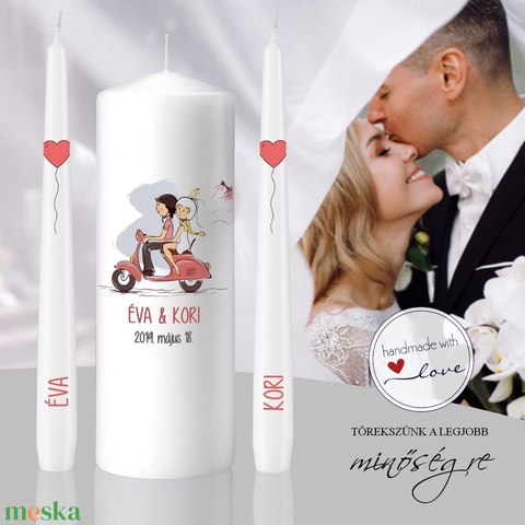 Fiatalos és vidám esküvői gyertyaszett. A Rózsaszín robogó esküvői gyertya szett nagy gyertyája fő motívuma egy rózsaszínű robogón (épen az esküvőjükről el)motorozó fiatal pár. A kép alatt a menyasszony és a vőlegény nevei, illetve az esküvő dátuma olvasható. A kísérő gyertyák alsó részén a keresztnevek, felül pedig egy-egy szív-alakú lufi került elhelyezésre.