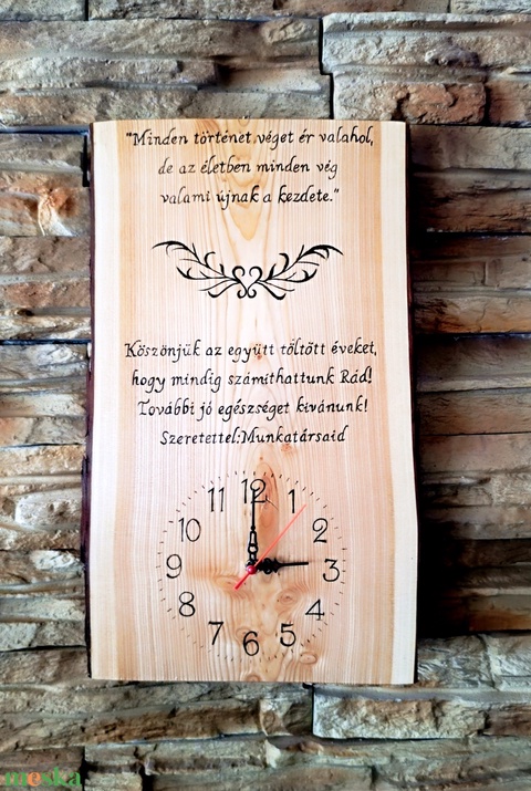 Egyedi, fából készült falióra nyugdíjas búcsúztató alkalmából idézettel