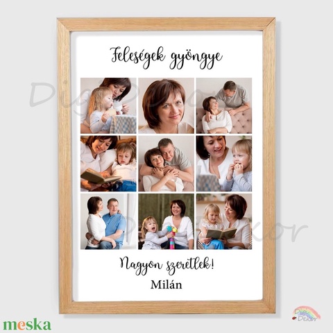 Kérhető digitálisan (PDF fájl), nyomtatott fényképként, vagy akár táblaképnek elkészítve, A4-es és A3-as méretben. A RÉSZLETEKÉRT GÖRGESS LEJJEBB! Egyedileg szerkesztett fotómontázs szerelmeseknek. Az általad küldött fényképeket (9 db-ot) illesztjük be a kollázs négyzetibe. Tökéletes, személyes ajándék Valentin-napra, évfordulóra, esküvőre, karácsonyra, születésnapra. A FOTÓKAT a rendelés leadása után, email-ben fogom elkérni a szöveggel együtt. Kérlek, jó minőségű, kellően nagy felbontású képeket küldj (egyenként minimum 1000 x 1000 pixel), illetve vedd figyelembe, hogy a fényképeket négyzet alakú helyekre fogjuk beilleszteni. A kép tervét átküldöm jóváhagyásra, és ha szükséges, módosítunk rajta. A képet többféle kivitelezésben kérheted: 1. DIGITÁLIS formában, PDF fájlként. Ez akár 1-2 napon belül megérkezik hozzád email-ben, csak a szerkesztést kell megvárnod. Ebben az esetben nincs postaköltség, a szállítási módnál válaszd a "Digitális fájl" opciót. A képet kinyomtathatod saját magad, vagy elviheted egy profi nyomdába. 2. Kiváló minőségű, FÉNYES fotópapírra NYOMTATVA, A4-es (21 x 29,7 cm) vagy A3-as (29,7 x 42 cm) méretben. Az ár kizárólag a printre vonatkozik, nem foglalja magában a termékfotókon látható képkeretet. A printeket celofán tasakban, vastag kartonlapok között, biztonságosan csomagolva küldjük. 3. A4-es méretű képkeretbe helyezve (több keretszínből választhatsz). A képet itt is fotópapírra nyomtatjuk, majd a keretbe téve postázzuk. A hátoldalon képakasztó és asztali támaszték is található. 4. TÁBLAKÉPNEK elkészítve: 8 mm vastag MDF lapra kasírozva, selyemfényű lakkozással, hátulján képakasztóval ellátva. (A táblaképhez már nem kell keret!) Itt is kétféle lehet a méret: 20 x 29 cm (kb. A4-es) vagy 29 x 41 cm (kb. A3-as). A képet ebben az esetben prémium matt fotópapírra nyomtatjuk, a lakkot finom ecsettel visszük fel, így a táblakép felülete nem lesz fényes, hanem kb. a viaszosvászon textúrájához fog hasonlítani.