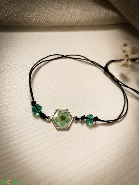 préselt virág, gyöngy, műgyanta, fém, makramézsinór