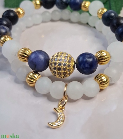 Szodalit és fehér jáde ásvány karkötő szett, arany színű cirkóniás díszekkel