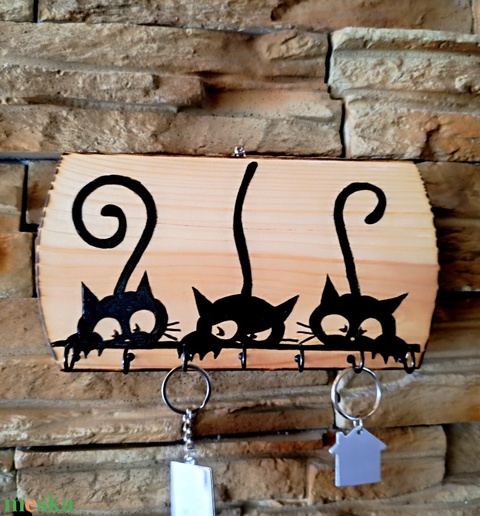 Fából készült fali kulcstartó három fekete cicával